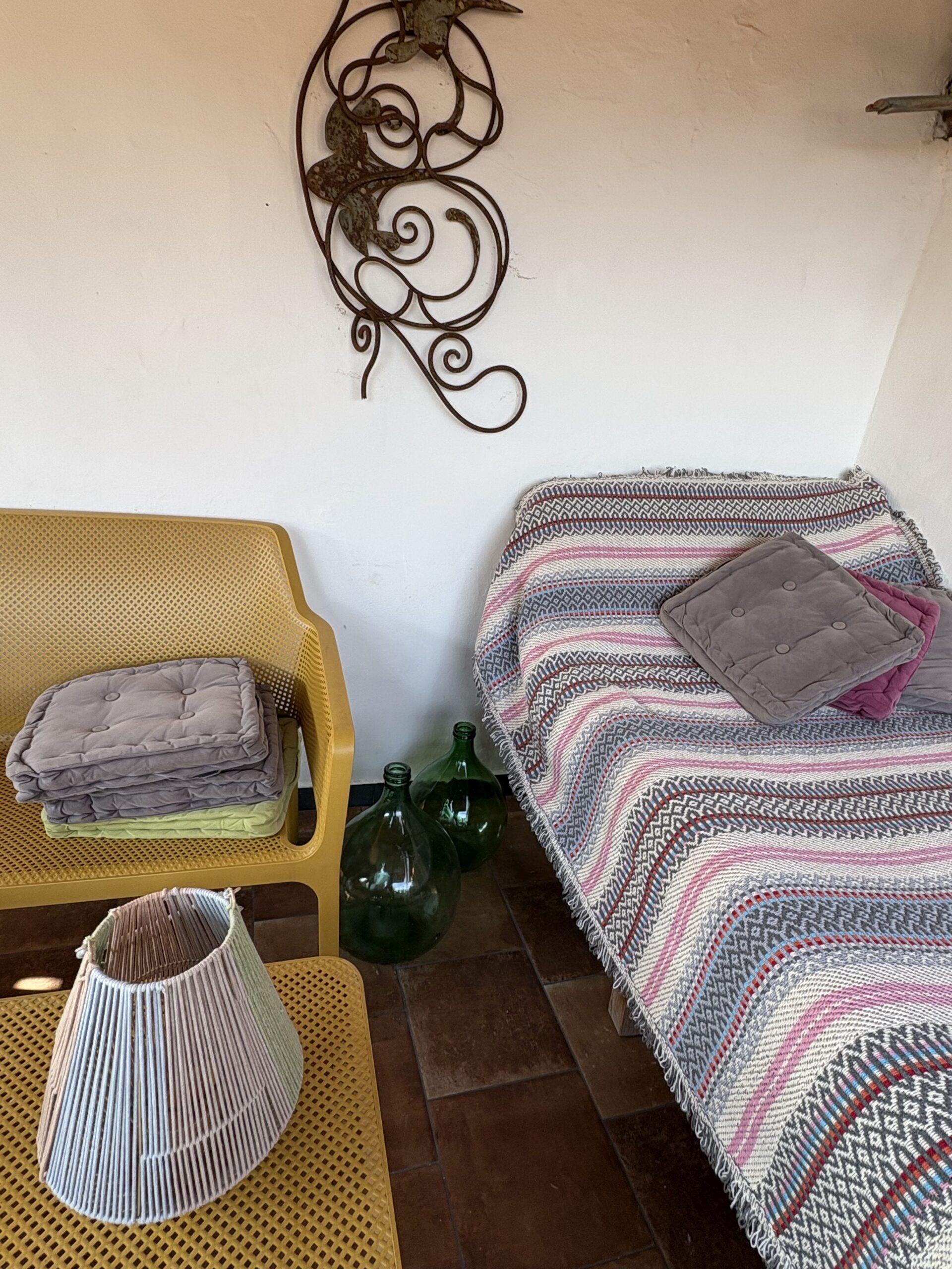 Mit viel Liebe zum Detail und Design sowie ganz im Sinne des Upcyclings wurde renoviert und eingerichtet: Antike Böden, Gewölbe und Flügeltüren blieben erhalten und wurden mit zeitgenössischem Design oder mit »neuen«, gebrauchten Stücken aus der Region kombiniert. So ist das Daybed im Wohnzimmer aus alten Türen gebaut. Antike Tische, Stühle und Spiegel wurden gemixt mit Möbeln aus Bauholz. Italienische Designerlampen wurden ersteigert und beleuchten nun die Küche sowie die Eingangshalle. Vintage Wollteppiche in leuchtendem Rosa, Lila und Grün machen gute Laune. Auch auf der Dachterrasse kann man es sich auf einem Daybed aus Bauholz gemütlich machen und bis zum Meer blicken.